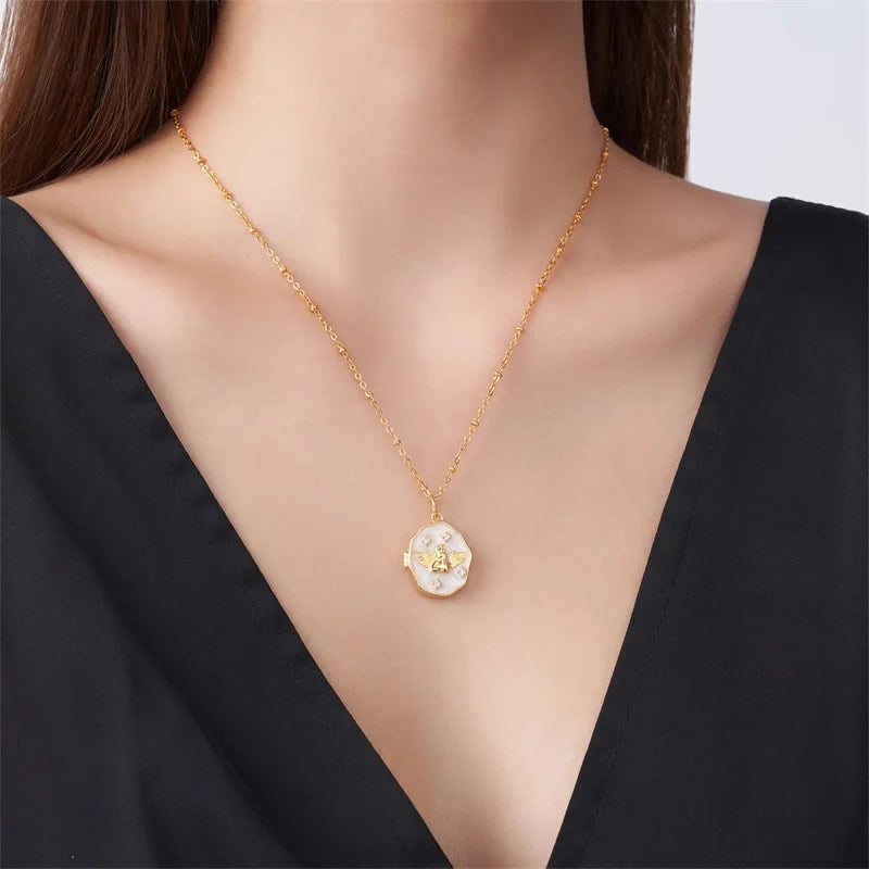 Lleva contigo a quienes más amas con este hermoso relicario personalizado “Butterfly Love”, un diseño elegante en tono dorado con incrustación de nácar y una delicada mariposa grabada.